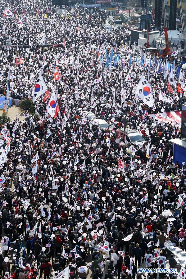 Supporters of President Park Geun-hye rally to show support in Seoul, South Korea, March 4, 2017. Supporters and opponents of South Korean President Park Geun-hye respectively held rallies in Seoul on Saturday. (Xinhua/Lee Sang-ho)