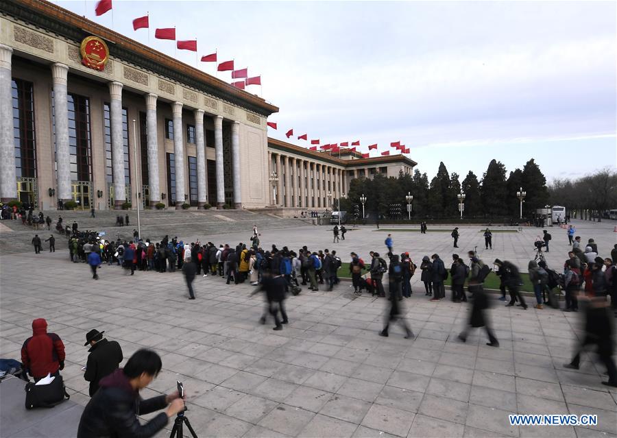 Journalists queue to enter the Great Hall of the People before the fifth session of China's 12th National People's Congress (NPC) in Beijing, capital of China, March 5, 2017. The fifth session of the 12th NPC will open in Beijing on March 5. (Xinhua/Yan Yan)