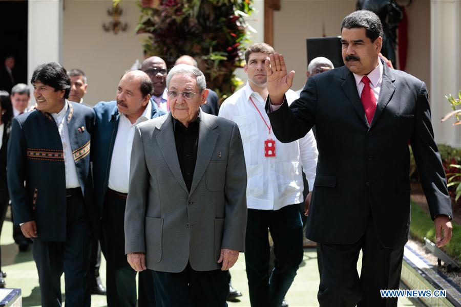 Photo taken on March 5, 2017 shows Venezuela's President Nicolas Maduro (1st R, front), Bolivia's President Evo Morales (1st L), Nicaragua's President Daniel Ortega (2nd L), and Cuban President Raul Castro (2nd R, front) before the 14th Summit of the Bolivarian Alliance for the Peoples of Our America (ALBA) in Caracas, Venezuela. (Xinhua/AVN)