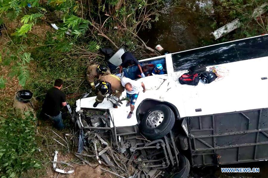 Image provided by the newspaper "La Estrella de Panama" shows firefighters searching for bodies of the victims in Anton region, Panama, on March 5, 2017. At least 16 people were killed on Sunday when a bus plunged off a bridge in central Panama, local media reported. (Xinhua/Lineth Torrero/El Siglo)