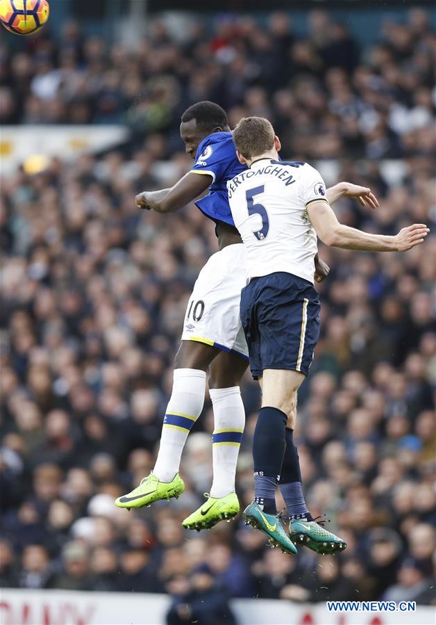 Romelu Lukaku(L) of Everton vies with Jan Vertonghen of Tottenham Hotspur during the English Premier League match between Tottenham Hotspur and Everton at White Hart Lane Stadium in London, Britain, on March 5, 2017. (Xinhua/Han Yan)