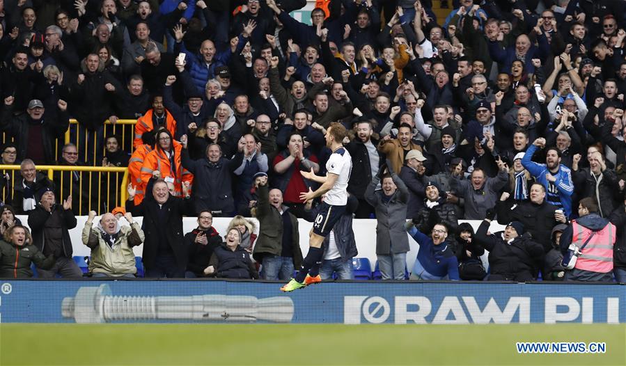 Harry Kane of Tottenham Hotspur celebrates after scoring during the English Premier League match between Tottenham Hotspur and Everton at White Hart Lane Stadium in London, Britain, on March 5, 2017. (Xinhua/Han Yan)