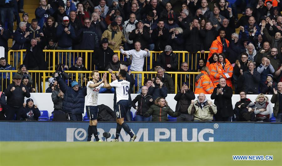 Harry Kane(L) of Tottenham Hotspur celebrates after scoring during the English Premier League match between Tottenham Hotspur and Everton at White Hart Lane Stadium in London, Britain, on March 5, 2017. (Xinhua/Han Yan)
