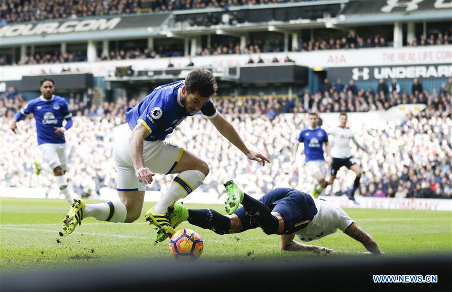 Kyle Walker (R) of Tottenham Hotspur is tackled by Leighton Baines of Everton during the English Premier League match between Tottenham Hotspur and Everton at White Hart Lane Stadium in London, Britain, on March 5, 2017. (Xinhua/Han Yan)