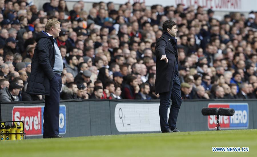 Mauricio Pochettino (R) , Manager of Tottenham Hotspur and Ronald Koeman, Manager of Everton look on during the English Premier League match between Tottenham Hotspur and Everton at White Hart Lane Stadium in London, Britain, on March 5, 2017. (Xinhua/Han Yan)
