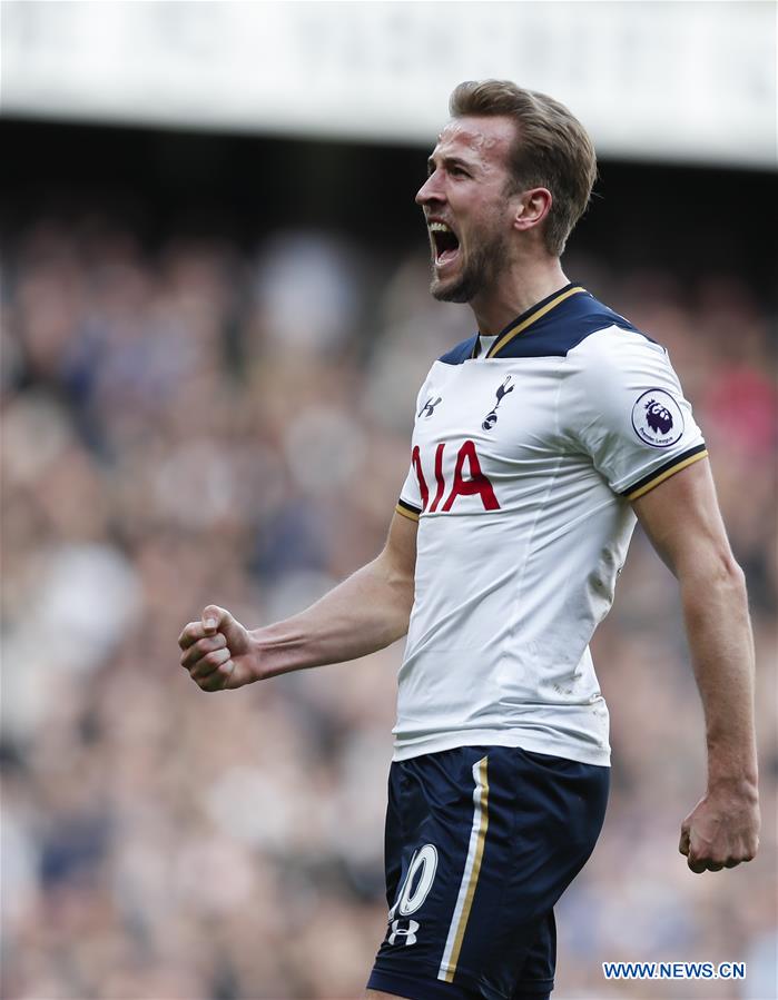 Harry Kane of Tottenham Hotspur celebrates after scoring during the English Premier League match between Tottenham Hotspur and Everton at White Hart Lane Stadium in London, Britain, on March 5, 2017. (Xinhua/Han Yan)