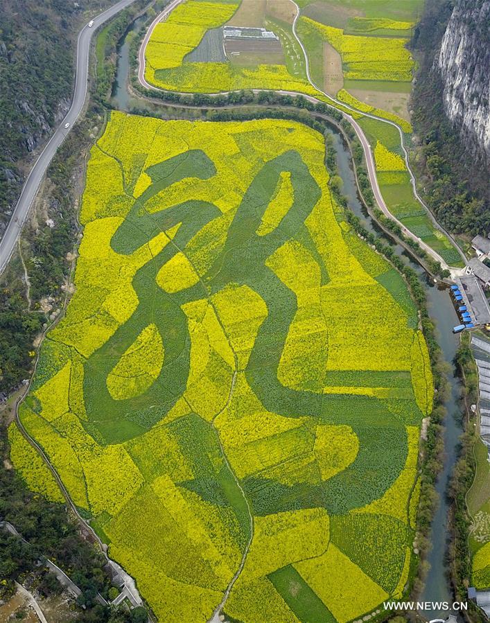 A Chinese character for "dragon" is seen amid rape flowers in the fields in Anshun City, southwest China's Guizhou Province, March 5, 2017. (Xinhua/Lu Wei)