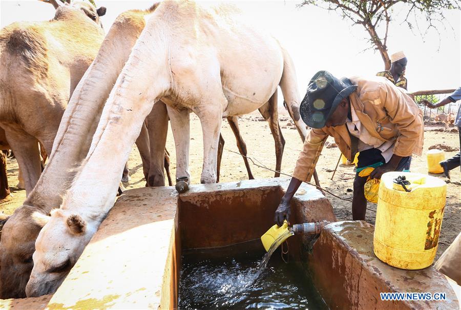 A herder collects water when camels drink water beside in Marsabit, one of the most severe drought-hit regions in Kenya, on March 4, 2017. The UN relief chief on Saturday urged international support for the estimated 2.7 million people in parts of Kenya who urgently need food and water following the onset of a severe drought. (Xinhua/Pan Siwei)