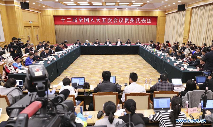 Photo taken on March 6, 2017 shows the scene of a plenary meeting of the 12th National People's Congress (NPC) deputies from Guizhou Province during the annual NPC session in Beijing, capital of China. The meeting was opened to media. (Xinhua/Pang Xinglei)