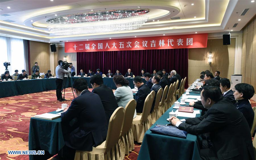 Photo taken on March 6, 2017 shows the scene of a plenary meeting of the 12th National People's Congress (NPC) deputies from Jilin Province during the annual NPC session in Beijing, capital of China. The meeting was opened to media. (Xinhua/Yang Zongyou)
