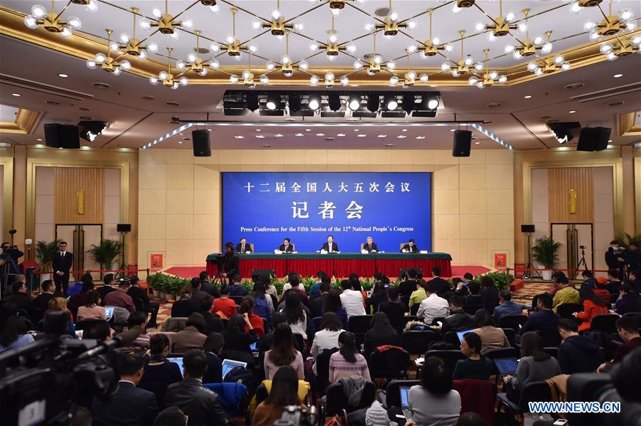 Chinese Minister of Agriculture Han Changfu and Vice Minister of Agriculture Zhang Taolin take questions on promoting agricultural structure reform on supply-side at a press conference for the fifth session of the 12th National People's Congress in Beijing, capital of China, March 7, 2017. (Xinhua/Li Xin)