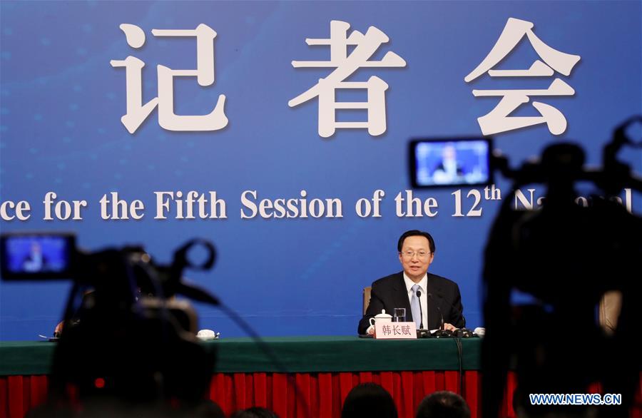Chinese Minister of Agriculture Han Changfu takes questions on promoting agricultural structure reform on supply-side at a press conference for the fifth session of the 12th National People's Congress in Beijing, capital of China, March 7, 2017. (Xinhua/Fei Maohua)