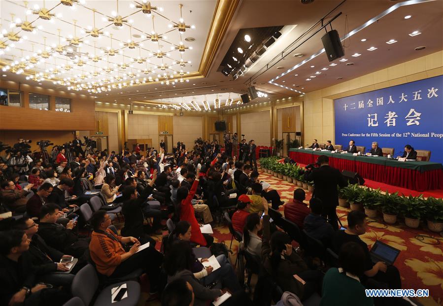 Chinese Minister of Agriculture Han Changfu and Vice Minister of Agriculture Zhang Taolin take questions on promoting agricultural structure reform on supply-side at a press conference for the fifth session of the 12th National People's Congress in Beijing, capital of China, March 7, 2017. (Xinhua/Fei Maohua)