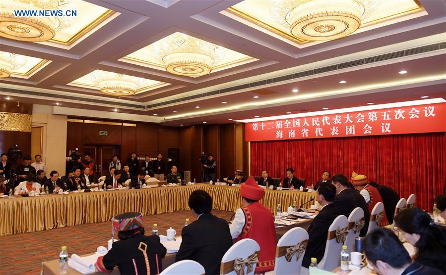 Photo taken on March 7, 2017 shows the scene of a plenary meeting of the 12th National People's Congress (NPC) deputies from Hainan Province during the annual NPC session in Beijing, capital of China. The meeting was opened to media. (Xinhua/Zhao Yingquan)
