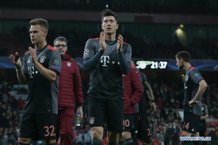 Joshua Kimmich (L) and Robert Lewandowski of Bayern Munich greet the spectators after the UEFA Champions League Round of 16 second leg match between Arsenal and Bayern Munich in London, Britain on March 7, 2017. Bayern Munich won 5-1 and advanced to the quarterfinal with 10-2 on aggregate. (Xinhua/Tim Ireland)