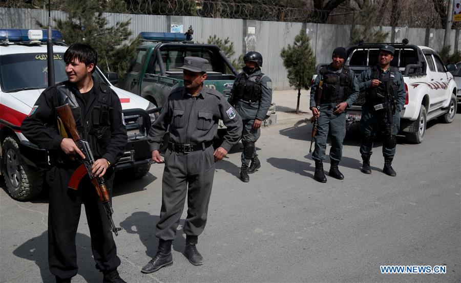 Afghan security force members stand near the site of an attack in Kabul, capital of Afghanistan, March 8, 2017. At least three persons were killed and 66 others wounded in a terrorist attack against a military hospital in Kabul on Wednesday, and three attackers also died, local media reported. (Xinhua/Rahmat Alizadah)