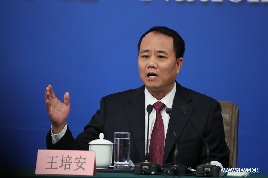 Wang Pei'an, deputy head of the National Health and Family Planning Commission (NHFPC), takes questions on health and family planning reforms at a press conference for the fifth session of the 12th National People's Congress in Beijing, capital of China, March 11, 2017. (Xinhua/Zhang Yuwei)
