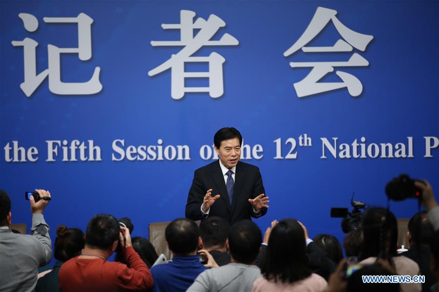 Chinese Minister of Commerce Zhong Shan communicates with journalists after a press conference on structural adjustments and innovation for the fifth session of the 12th National People's Congress in Beijing, capital of China, March 11, 2017. (Xinhua/Jin Liwang)