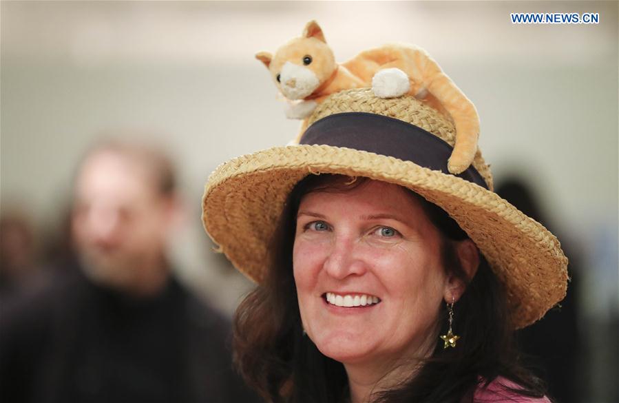 A visitor with a cat decoration on her hat attends the Cat Camp in New York, the United States, on March 11, 2017. The two-day Cat Camp, the city's first feline-focused conference and adoption extravaganza, kicked off here on Saturday, bringing cat lovers to attend cat adoption events, cat-focused fairs and presentations. (Xinhua/Wang Ying)
