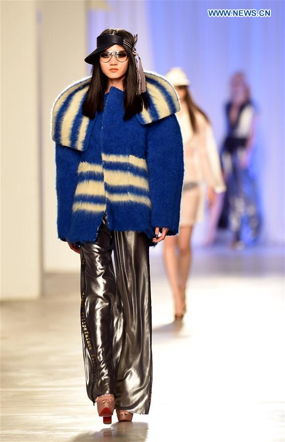 A model presents a creation of designer Filipe Faisca at the Lisbon Fashion Week Fall/Winter 2017/18 in Lisbon, capital of Portugal, on March 11, 2017. (Xinhua/Zhang Liyun)
