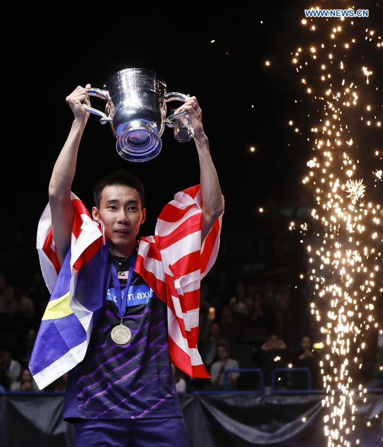 Lee Chong Wei of Malaysia celebrates during the awarding ceremony after men's singles final with Shi Yuqi of China at All England Open Badminton Championships 2017 in Birmingham, Britain on March 12, 2017. (Xinhua/Han Yan)