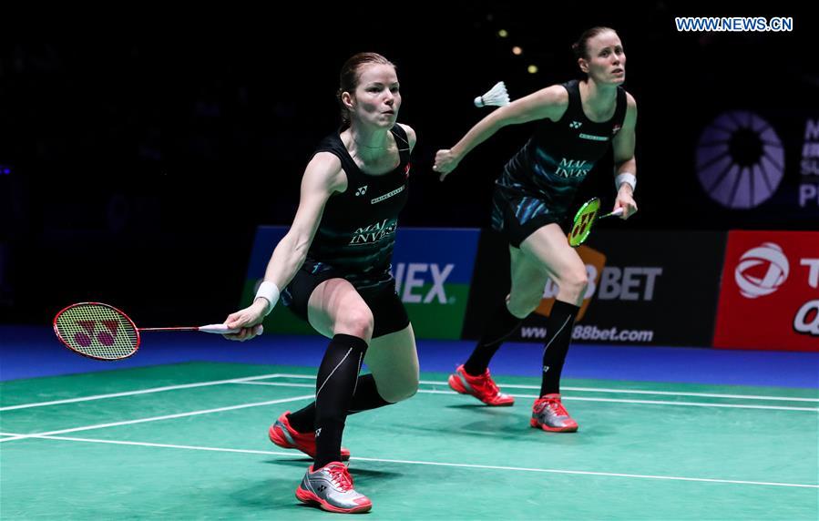 Kamilla Rytter Juhl (R) /Christinna Pedersen of Denmark compete during the women's doubles final with Chang Ye Na/Lee So Hee of South Korea at All England Open Badminton Championships 2017 in Birmingham, Britain on March 12, 2017. (Xinhua/Tang Shi)