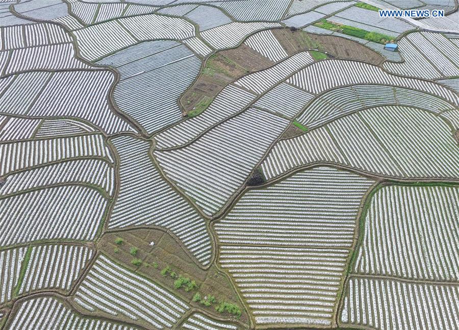 Aerial photo taken on March 13, 2017 shows fields covered with films at Bantuan Village of Luocheng County, south China's Guangxi Zhuang Autonomous Region.