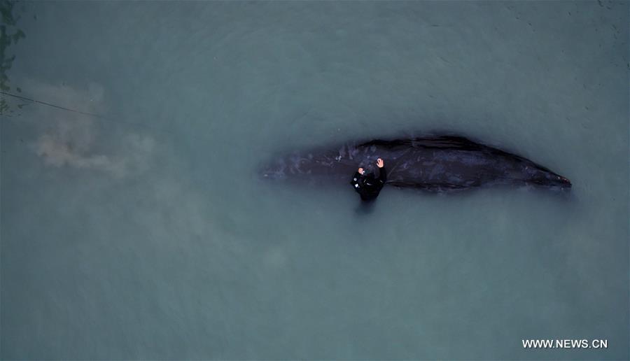 A diver sets an auditory sense testing apparatus on a sperm whale near a dock in Huizhou Harbor in Huizhou, south China's Guangdong Province, March 14, 2017. A sperm whale stranded near a dock in Huizhou on Tuesday. The rescue work is under way in difficulty since the whale seems weak. (Xinhua/Mao Siqian)