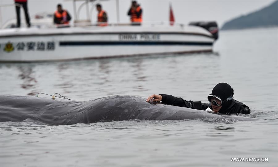 A diver sets an auditory sense testing apparatus on a sperm whale near a dock in Huizhou Harbor in Huizhou, south China's Guangdong Province, March 14, 2017. A sperm whale stranded near a dock in Huizhou on Tuesday. The rescue work is under way in difficulty since the whale seems weak. (Xinhua/Mao Siqian)