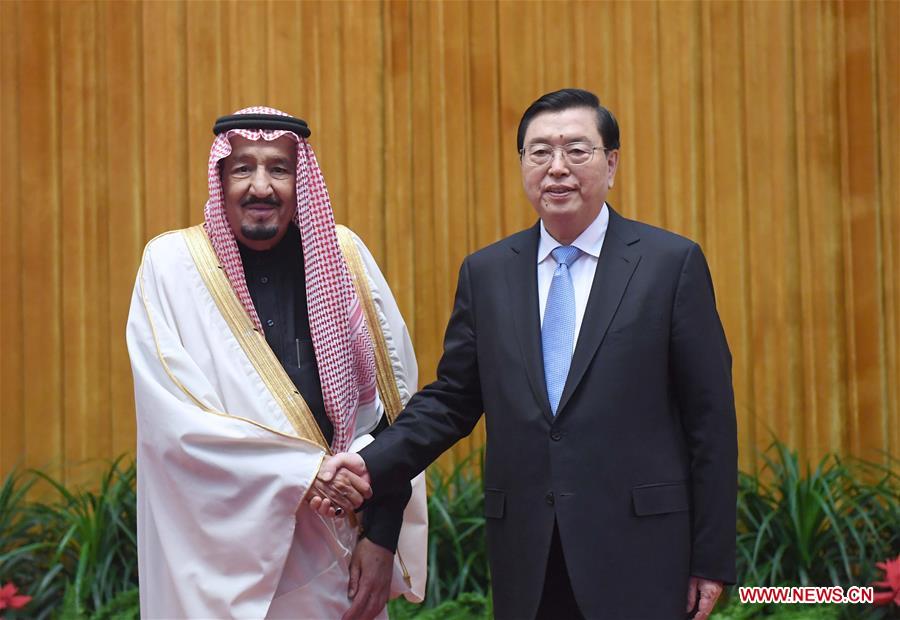 Zhang Dejiang (R), chairman of the Standing Committee of China's National People's Congress, meets with Saudi King Salman bin Abdulaziz Al Saud at the Great Hall of the People in Beijing, capital of China, March 17, 2017. (Xinhua/Zhang Duo)