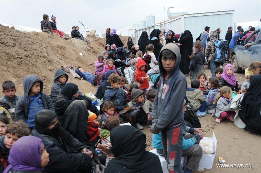 A group of displaced Iraqis from Mosul wait to be relocated at the Hammam Aleel Camp, Iraq, on March 19, 2017. At about 20 km south of Mosul, Hammam Aleel Camp is an important hub for the civilians from Mosul to be relocated. According to a Camp official, more than 35,000 people lived here at the peak, and about 10,000 people are relocated here at present. (Xinhua/Wei Yudong)