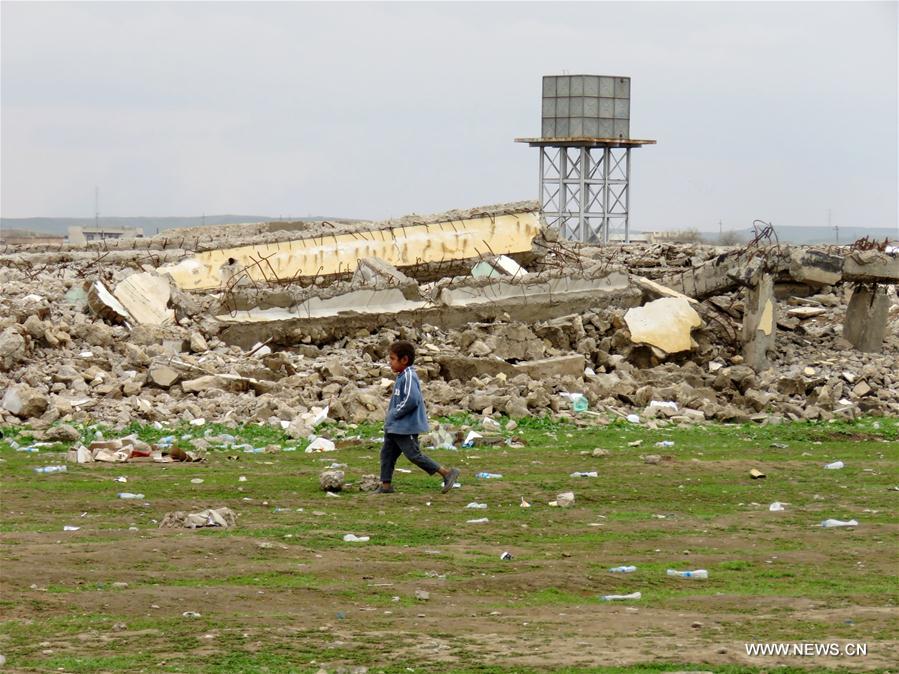 A boy is pictured in front of the ruins of a building outside the Hammam Aleel Camp, Iraq, on March 19, 2017. At about 20 km south of Mosul, Hammam Aleel Camp is an important hub for the civilians from Mosul to be relocated. According to a Camp official, more than 35,000 people lived here at the peak, and about 10,000 people are relocated here at present. (Xinhua/Khalil Dawood)