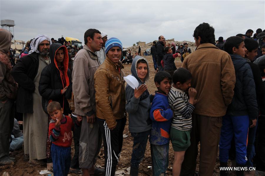 Displaced people wait in line for their food ration at the Hammam Aleel Camp, Iraq, on March 19, 2017. At about 20 km south of Mosul, Hammam Aleel Camp is an important hub for the civilians from Mosul to be relocated. According to a Camp official, more than 35,000 people lived here at the peak, and about 10,000 people are relocated here at present. (Xinhua/Wei Yudong)