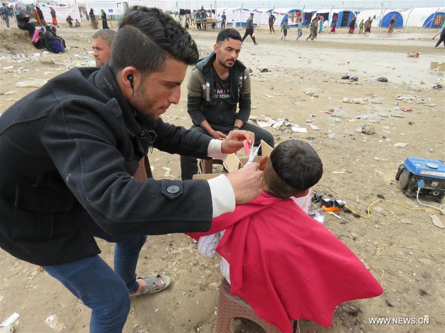 A barber cut the hair for a boy at the Hammam Aleel Camp, Iraq, on March 19, 2017. At about 20 km south of Mosul, Hammam Aleel Camp is an important hub for the civilians from Mosul to be relocated. According to a Camp official, more than 35,000 people lived here at the peak, and about 10,000 people are relocated here at present. (Xinhua/Khalil Dawood)