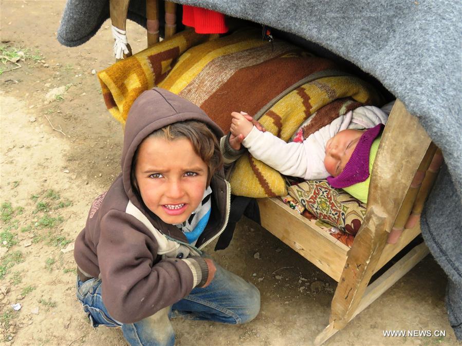 Four-year-old Mustafa looks after his six-month-old brother at the Hammam Aleel Camp, Iraq, on March 19, 2017. At about 20 km south of Mosul, Hammam Aleel Camp is an important hub for the civilians from Mosul to be relocated. According to a Camp official, more than 35,000 people lived here at the peak, and about 10,000 people are relocated here at present. (Xinhua/Khalil Dawood)