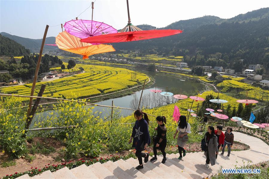 Tourists walk in Sanyuan Township of Santai County in southwest China's Sichuan Province, March 20, 2017. In recent years, villages in Sichuan Province developed the countryside tourism by improving the service and environment. (Xinhua/Jiang Hongjing)