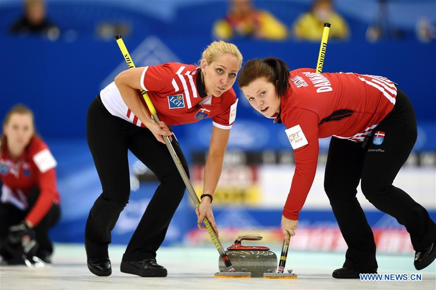 Denise Dupont (L) and Stephanie Risdal of Denmark compete during the World Women's Curling Championship round-robin match against China in Beijing, capital of China, March 21, 2017. Denmark lost 5-7. (Xinhua/Ju Huanzong)