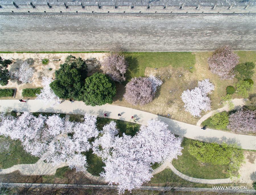Aerial photo taken on March 22, 2017 shows the spring scenery at the Huancheng Park in Xi'an, capital of northwest China's Shaanxi Province. (Xinhua/Shao Rui)