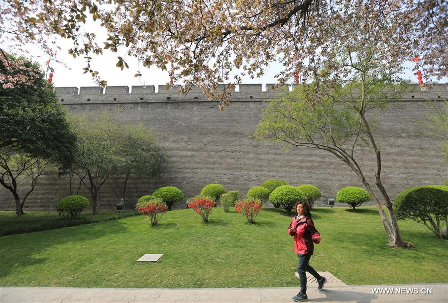 A woman walks at the Huancheng Park in Xi'an, capital of northwest China's Shaanxi Province, March 22, 2017. (Xinhua/Shao Rui)