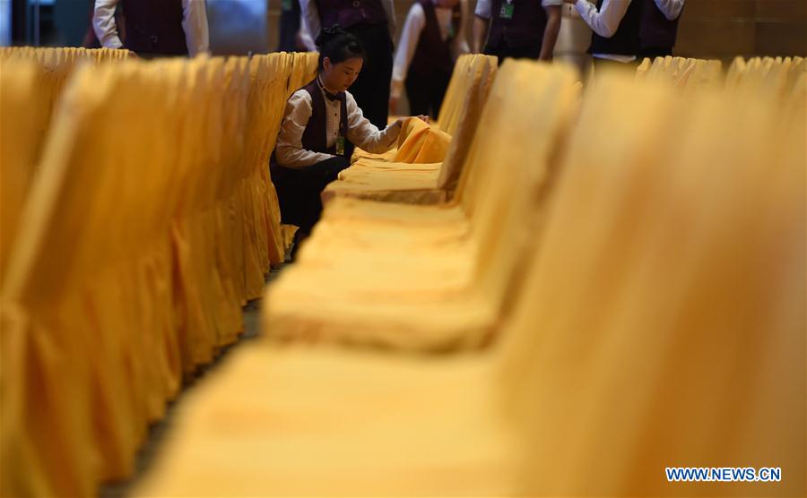 A staff member prepares for the 2017 Boao Forum for Asia Annual Conference (BFA) at the conference hall in Boao, south China's Hainan Province, March 22, 2017. The 2017 BFA will be held from March 23 to 26 this year. (Xinhua/Yang Guanyu)