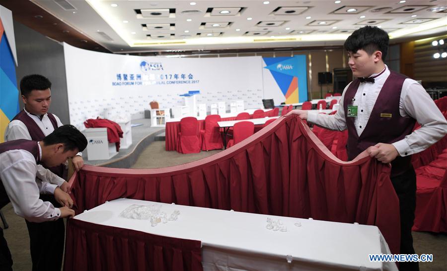 Staff members prepares for the 2017 Boao Forum for Asia Annual Conference (BFA) at the conference hall in Boao, south China's Hainan Province, March 22, 2017. The 2017 BFA will be held from March 23 to 26 this year. (Xinhua/Zhao Yingquan)