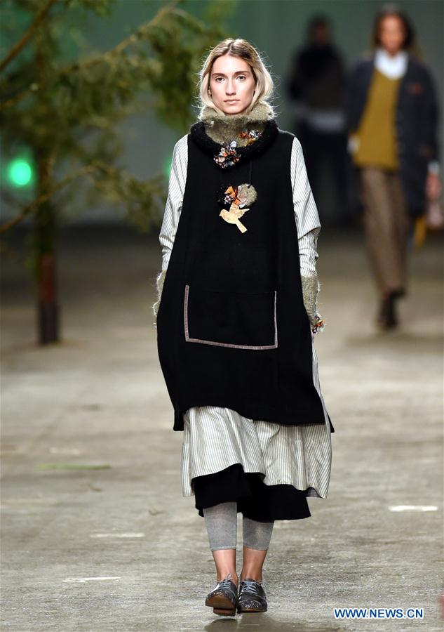 A model presents a creation of designer Teresa Martins during the 40th Portugal Fashion Week in Lisbon, Portugal, on March 22, 2017. (Xinhua/Zhang Liyun)