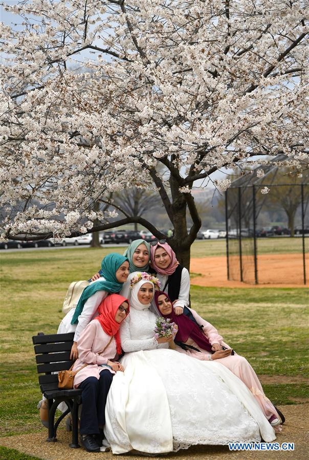 People pose for photos with cherry blossoms around the Tidal Basin in Washington D.C., capital of the United States, on March 25, 2017. (Xinhua/Yin Bogu)