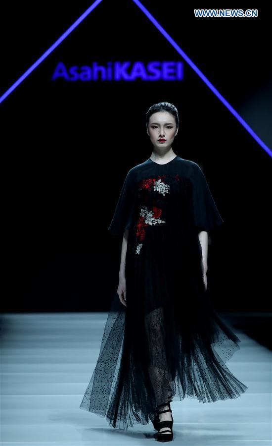 A model presents a creation by Tom Dong at the collection show "Asahi Kasei Chinese Fashion Designer Creativity Award" during China Fashion Week in Beijing, capital of China, March 26, 2017. (Xinhua/Chen Jianli)