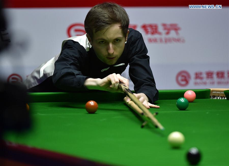 Scott Donaldson of Scotland takes a shot during the first round of 2017 World Snooker China Open Tournament against Stuart Bingham of England, in Beijing, capital of China, March 27, 2017. Scott Donaldson lost 3-5. (Xinhua/Zhang Chenlin)