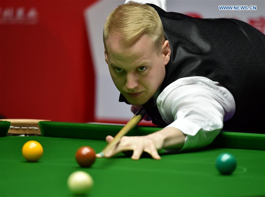Allen Taylor of England competes during the first round of 2017 World Snooker China Open Tournament against his compatriot Shaun Murphy, in Beijing, capital of China, March 27, 2017. Allen Taylor lost 2-5. (Xinhua/Zhang Chenlin)