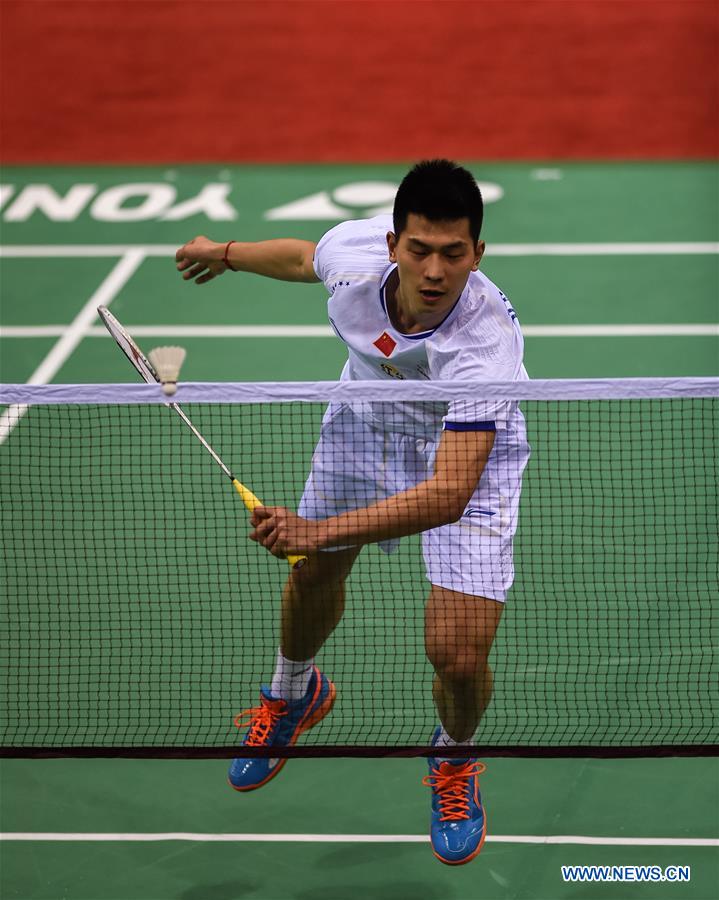 Zhao Junpeng of China competes during the men's singles first qualification round against Abhishek Yelegar of India in Yonex Sunrise Indian Open Badminton Championship in New Delhi, India, March 28, 2017. Zhao Junpeng won 2-0. (Xinhua/Bi Xiaoyang)