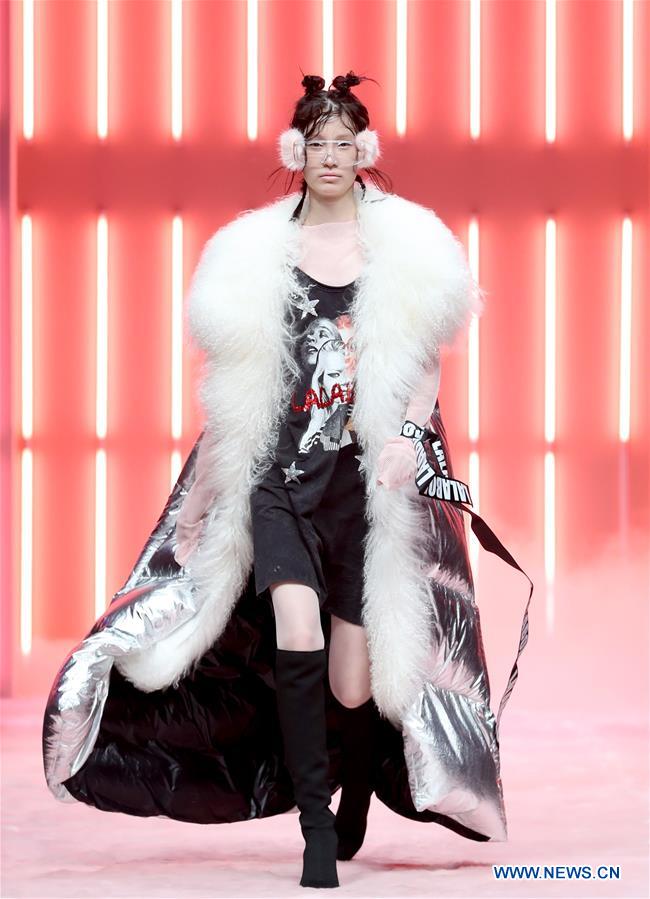 A model presents a creation designed by Yu Xizi during China Fashion Week in Beijing, capital of China, March 28, 2017. (Xinhua/Chen Jianli)