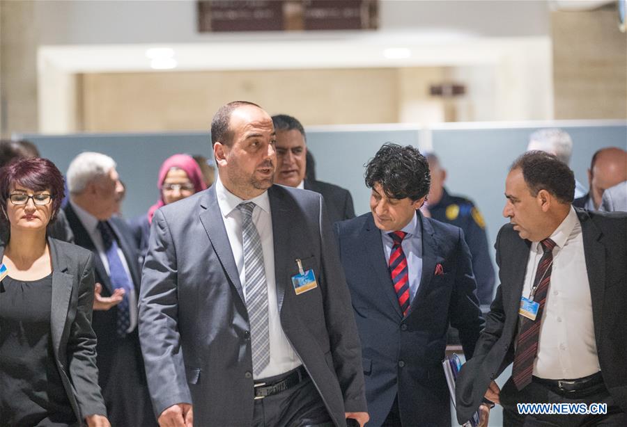 Syria's opposition delegation leader Nasr al-Hariri (2nd L, front) arrives for a meeting of Intra-Syria peace talks with UN Special Envoy for Syria Staffan de Mistura at Palais des Nations in Geneva, Switzerland, March 28, 2017. (Xinhua/POOL/Xu Jinquan)