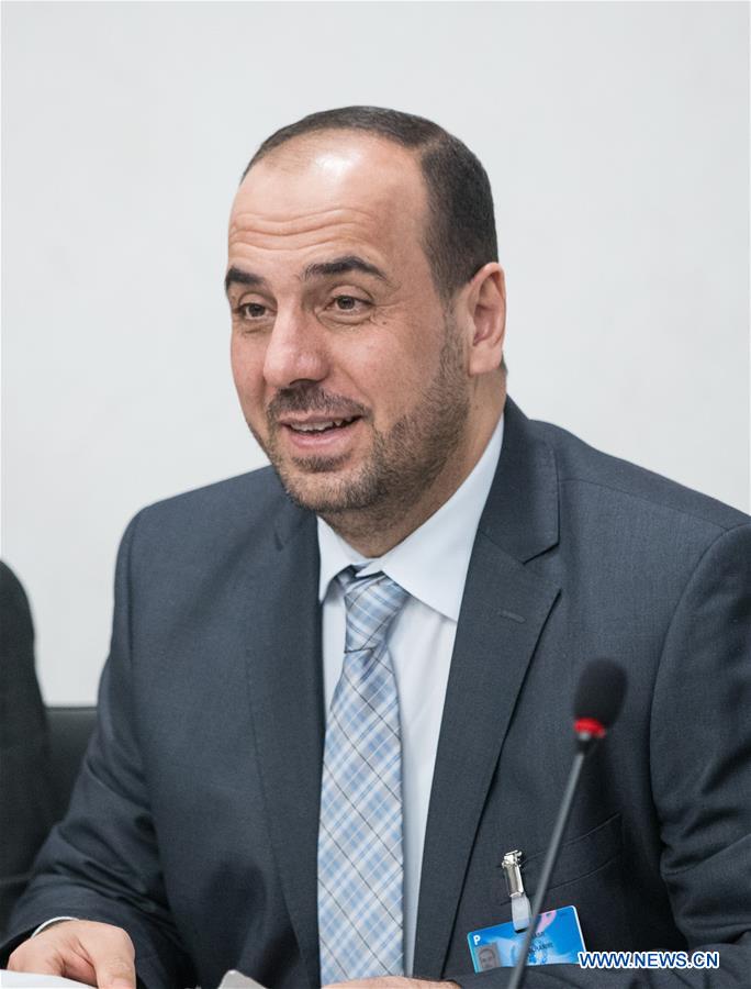 Syria's opposition delegation leader Nasr al-Hariri attends a meeting of Intra-Syria peace talks with UN Special Envoy for Syria Staffan de Mistura (Unseen) at Palais des Nations in Geneva, Switzerland, March 28, 2017. (Xinhua/POOL/Xu Jinquan)